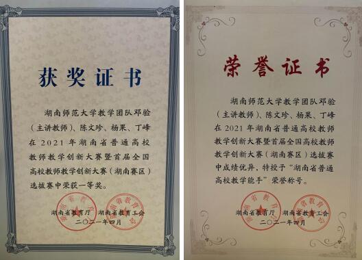近日,湖南省教育厅和省教育工会公布了2021年湖南省普通高校教师教学创新大赛暨首届全国高校教师教学创新大赛(湖南赛区)选拔赛结果。永利官网教学团队邓验(主讲教师)、陈文珍、杨果、丁峰荣获一等奖,并被授予“湖南省普通高校教学能手”荣誉称号。