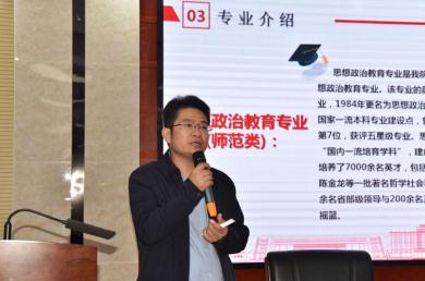 赵子林副院长介绍了思政教育专业的发展历程和建设现状,着重展示了专业的特色与优势。他强调思政教育专业办学底蕴深厚,学科支撑有力,师资力量雄厚,课程特色鲜明,实践教学优化,人才培养一流。他鼓励同学们强化专业意识,夯实专业功底。