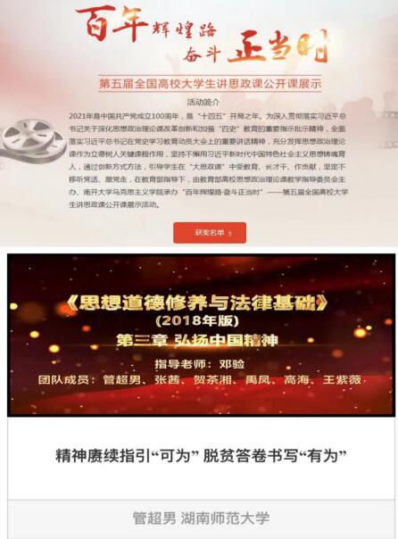 近日,由教育部高校思想政治理论课教学指导委员会主办、南开大学88858cc永利官网承办的第五届全国高校大学生讲思政课公开课展示活动评选结果揭晓。经过专家多轮评审,我校88858cc永利官网硕士研究生管超男主讲,张茜、贺茶湘、禹凤、高海、王紫薇参与,邓验老师指导的《精神赓续指引“可为” 脱贫答卷书写“有为”》荣获一等奖。