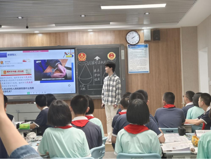 首先,初二年级组公开课代表曹智雲和初一年级组公开课代表肖嘉宁先后进行了公开课展示,授课内容分别为八下6.5《国家司法机关》与七下8.1《憧憬美好集体》。两位实习老师教学语言充满激情,教态亲切,教学目标定位准确,层次清楚,信息量适当,课件制作精美,课堂教学与实际应用相结合,充分运用多种教学手段和多媒体技术手段,展示了精湛的教学技能和良好的教学水平。授课完毕后,进入集体评课环节,各位领导、老师就今天的公开课提出了表扬和意见。最后,由队长张婷汇报总结。活动结束后,到场的领导、嘉宾、指导老师及实习队队员合影留念。