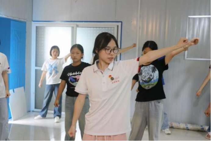 实践团开办了“朝阳辅导班”负责此活动,由十位老师主持,并根据学生身心成长的多元需求,开办了丰富的课程。杨子萱详细讲解了古典舞的蹈动作要点,一对一地纠正与指导。在宗琳琳的示范和指导下,同学们伴随音乐进行手势舞的练习,逐步掌握了手势动作。刘乐、李江容和袁乐怡引导学生正确发声、掌握音准,从而增强合唱效果、体验说唱乐趣。夏年彬、李茂环、刘佳和关旭琪带领学生们活动身体、舒展四肢,学习太极拳与啦啦操,“传统”与“现代”之美交映。谢雨珂教授三种折纸技巧,让彩色的纸片在学生手中化为一群群小鸡、蝴蝶和小鱼。