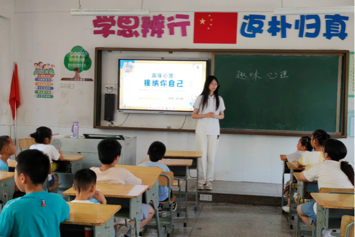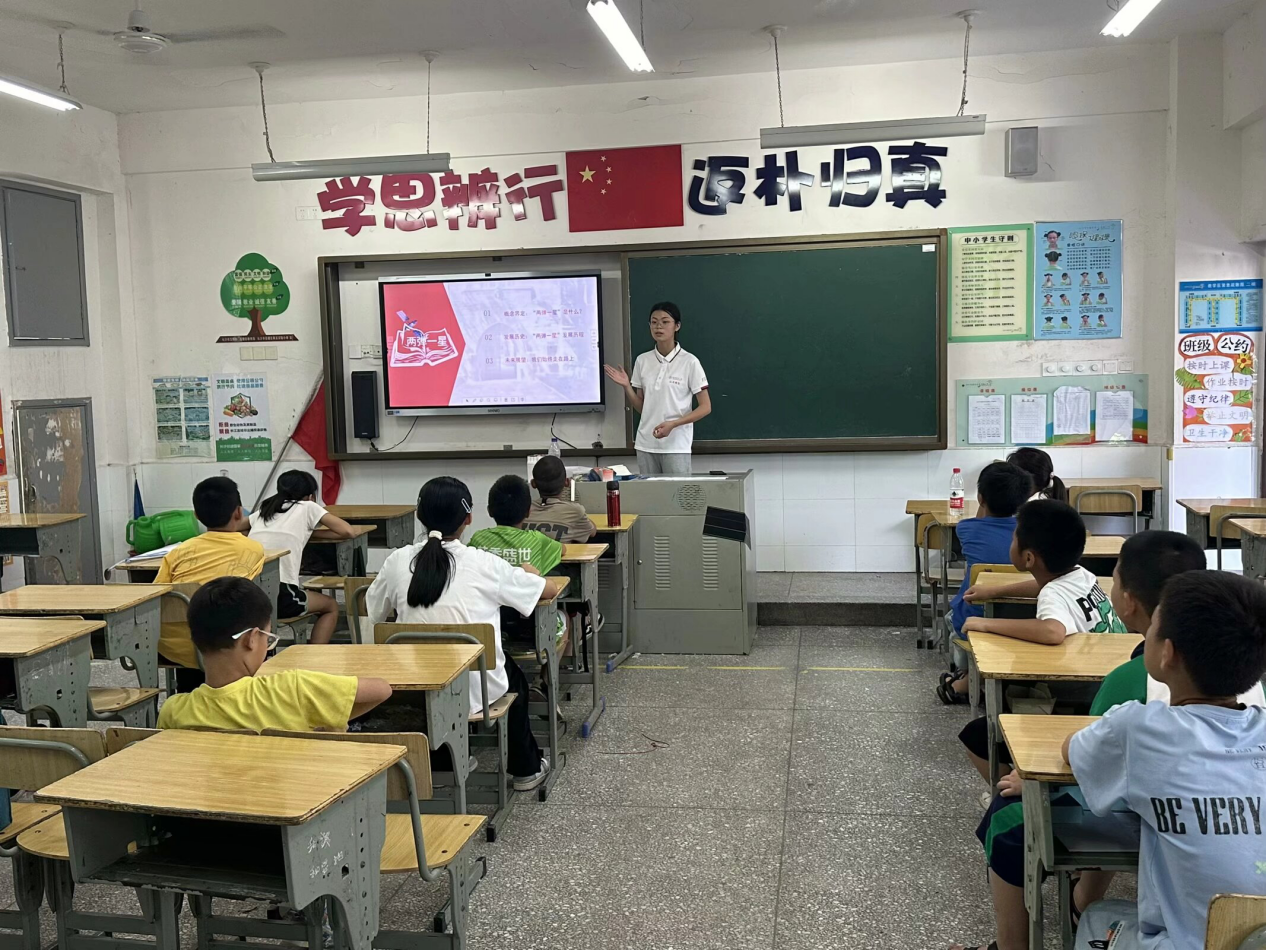 向瑞琦带领大家走进科学,探秘生活中的有趣现象。朱琎榕发挥自身专业优势,向学生们介绍了植物颜色主要来源——花青素,根据花青素酸红碱蓝的原理,与学生们一同完成科学小实验。肖惜文和顾语欣鼓励学生们通过模仿不同的动画角色,感受不同角色的情感与魅力。文禾君带领同学们一起观看电影《长津湖》,感悟爱国主义思想。李慧雅在党史教育的课堂上与同学们回顾“两弹一星”那些事,分析科学家的可贵精神品质。许潍麟引导同学们探索空气炮的原理,同时大胆尝试、动手制作,探究科学之奥妙。曾子璇解析趣味心理,教学生在成长的过程中悦纳自己。