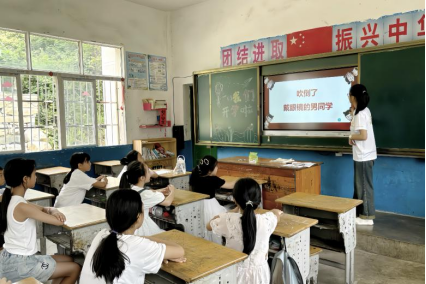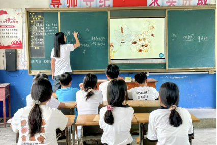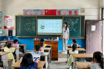 实践团首日开展的课程分为音乐、普通话、饮食文化三个模块。赵禹童在一班开展了以“听!龙溪铺的声音”为主题的音乐课程,通过展示龙溪铺镇的方言、民歌,来激发学生的学习兴趣,同时用有趣的声音互动游戏,引出龙溪铺镇的特色乐器——龙溪鼓及其背后的故事,揭示了传承与弘扬乐器文化的价值,并增强了学生的文化保护意识。二班开展了由王瑞东主讲的普通话课程,此课程包括组织趣味游戏“大风吹”、讲解语音的基本概念,强调不同发音的注意事项等环节,加深了学生对于普通话的了解。陈米琪以“饮食文化”为主题,在三班开展课程,从自然、人文两个角度进行教学,帮助学生理解课程内容,发展跨学科知识融合的能力,并助力培养学生的综合思维。