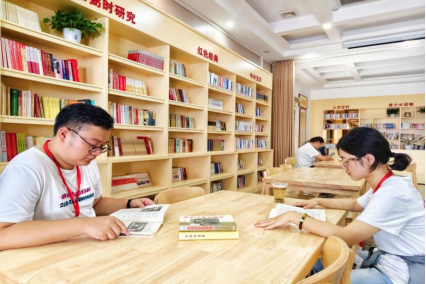 实践团负责人薛佳宇、成员唐卓雅在馆内查阅资料