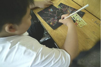 张佳蓉为学生们详细讲解了刮画艺术的独特魅力和创作要领,为学生后续创作奠定理论基础。创作环节,学生们手持刮画笔刮擦纸面,随着黑色图层剥落,底下隐藏的色彩逐渐显现。学生们发挥其想象力,画出海底世界、空中火箭、乡村景象等多元内容。实践团成员在强调安全使用刮画工具的同时,及时为遇到困难的学生提供针对性的建议与帮助。“我画了小小的世界”,“我的画表达了勿念过往、珍惜当下的主题”,创作完成后,学生们踊跃展示自己的作品,相互交流、分享自己的想法。